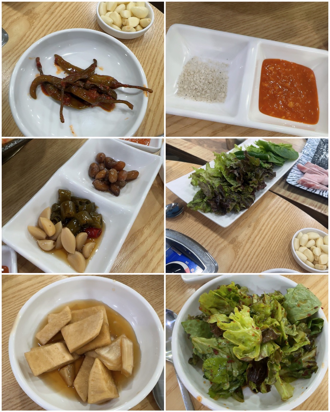 쌈채소, 마늘, 쌈장, 소금에 장아찌류나 콩장, 고추무침까지 다양하게 나와요.